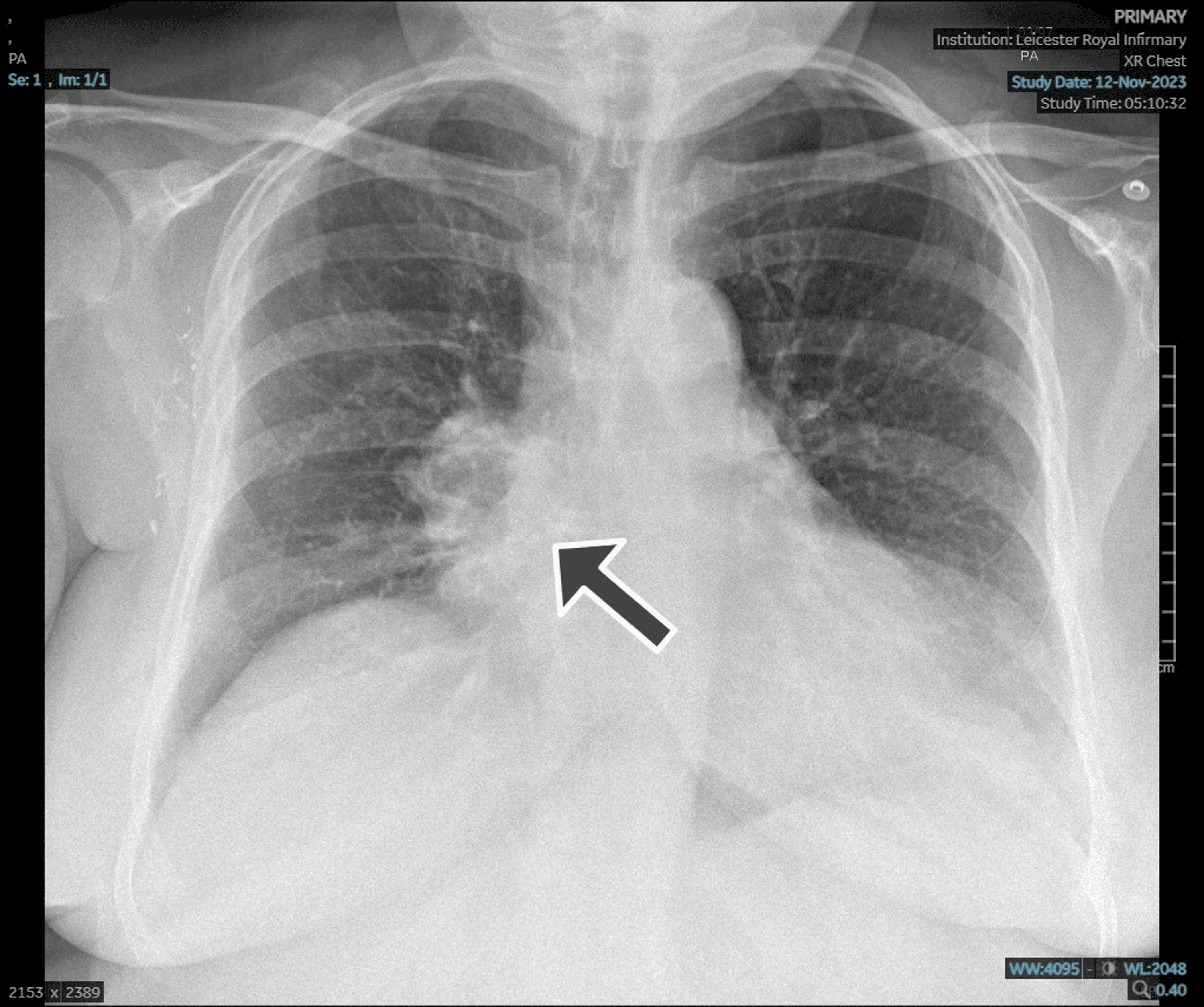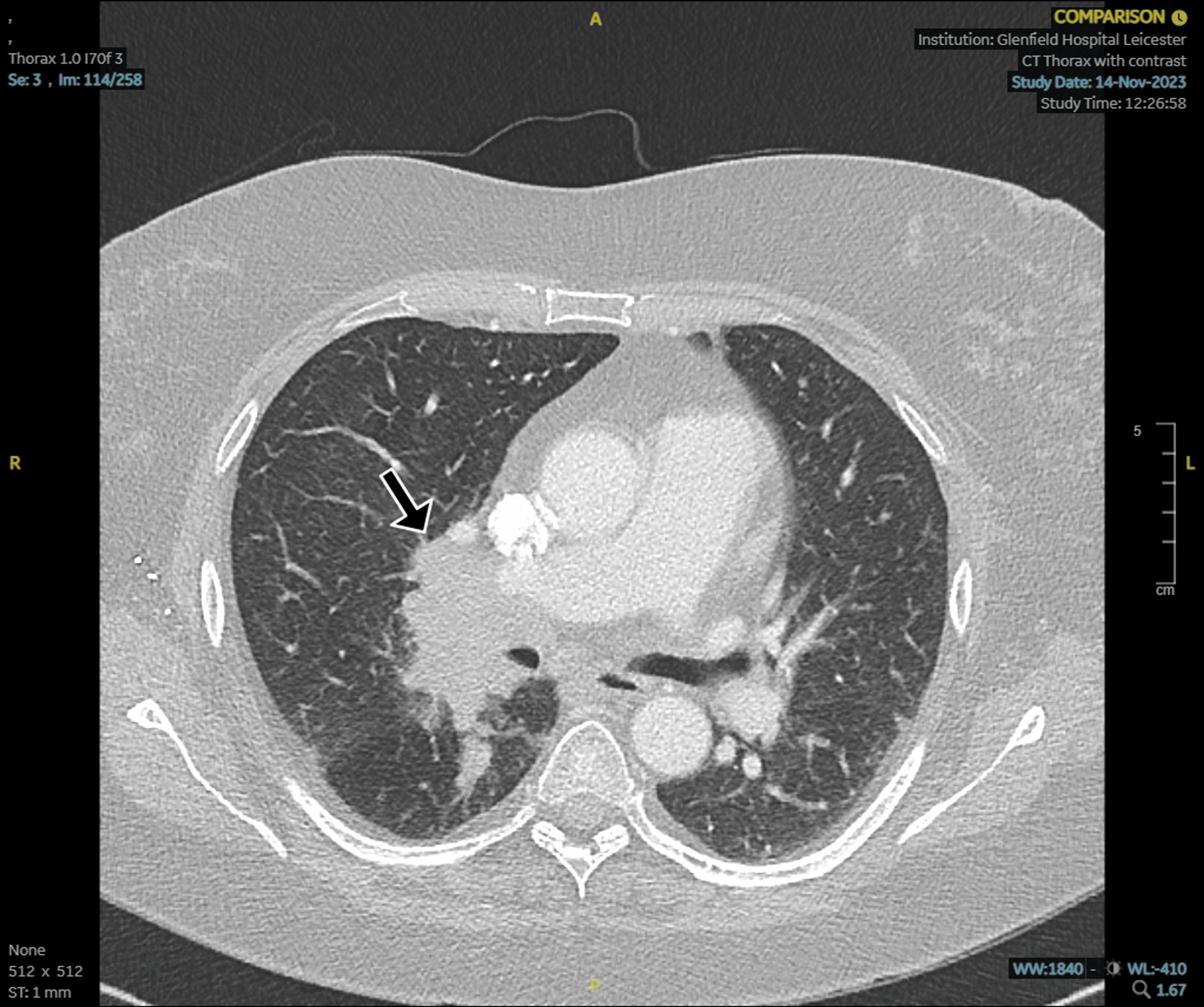 The patient presented with chest pain with respiratory symptoms, and an initial chest radiograph was suggestive of lung cancer (Figure 1).