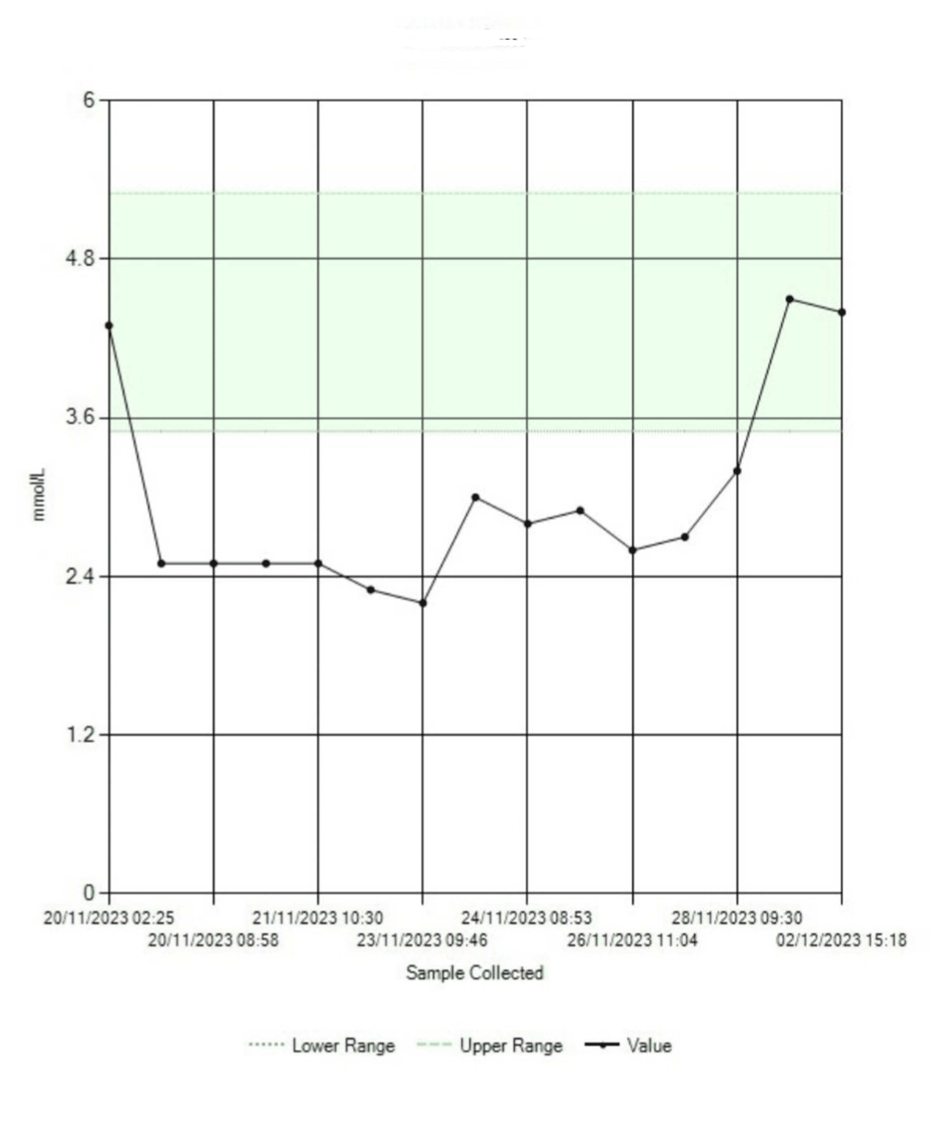 Serum potassium 2.4 mmol/L 3.5–5.0 mmol/L Marked hypokalaemia