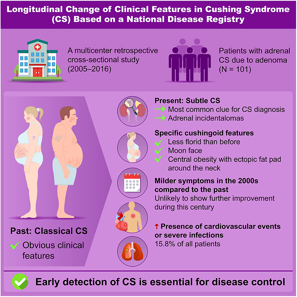In conclusion, cases of adrenal CS in the 2000s were less florid than in previous decades although no further clinical improvement was observed during this century. A new model for the early detection of CS is necessary, as the prevalence of CS-related complications remains high. To reduce the time to diagnosis of adrenal CS, it is important to avoid overlooking moon face and central obesity with dorsocervical and/or subclavian fat pad, assess morning ACTH and serum cortisol after a DST with higher cutoff values than those recommended by the Endocrine Society, use abdominal computed tomography, and consider tumor size and patient sex when evaluating patients with suspected CS. Additional studies are needed to create a more effective diagnostic method for earlier identification of CS.