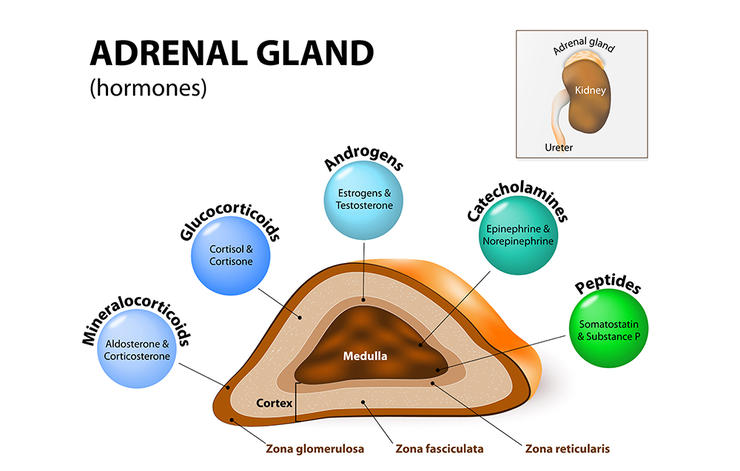 You have two adrenal glands in your body. These small triangular glands, one on top of each kidney, produce essential hormones such as aldosterone, cortisol and male sex hormones such as DHEA and testosterone.